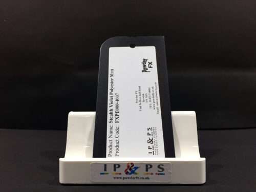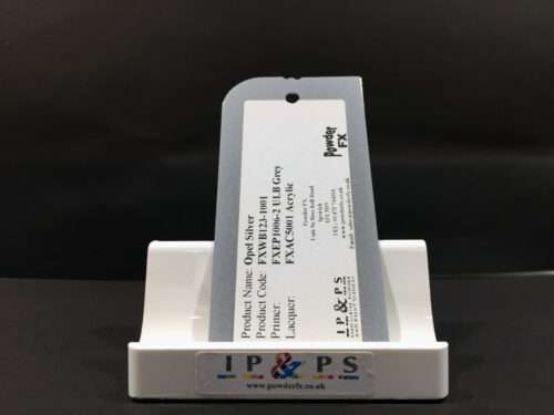 The metal swatch panels are labelled with the paint system used with all relevant product codes.